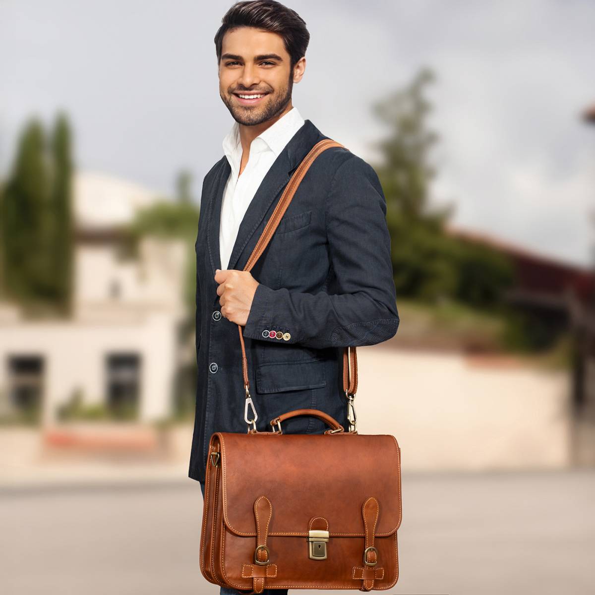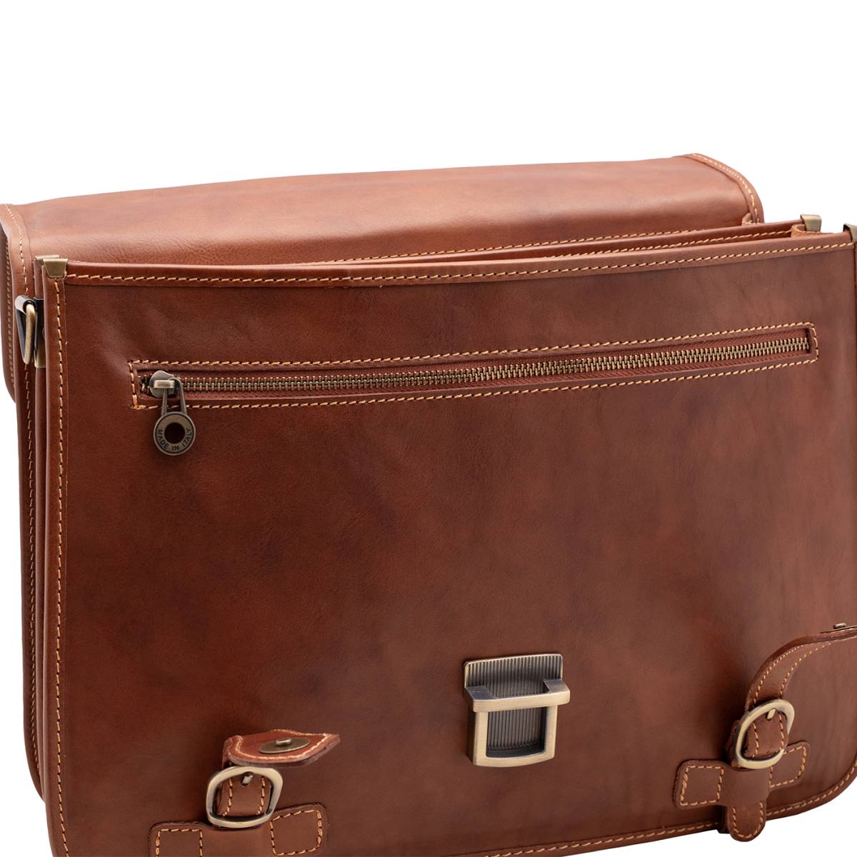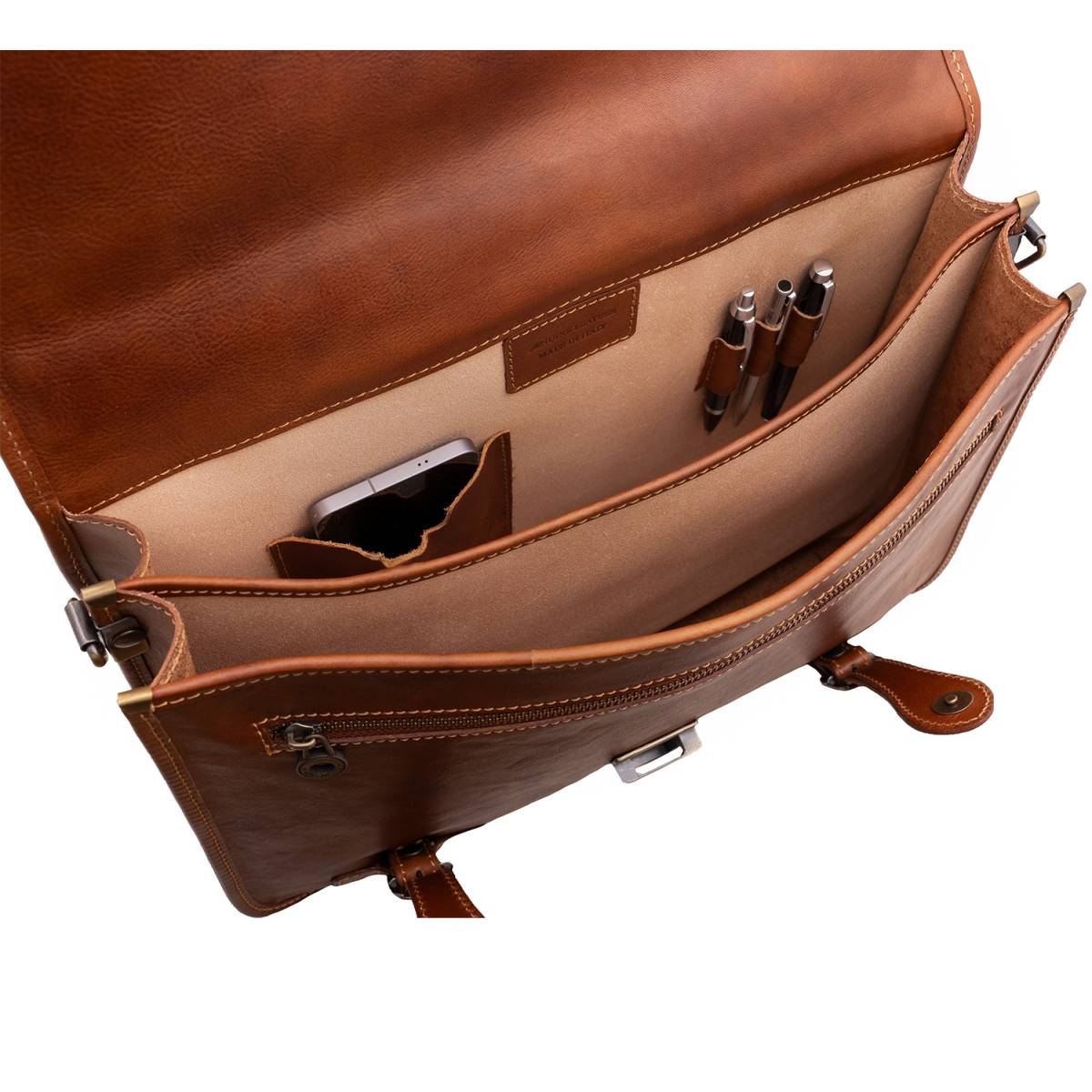 Genuine leather briefcase with two compartments, bag equipped with a large pocket on the front and one on the back with metal zip, internally it has a pen holder and mobile phone holder. The main closure is entrusted to a metal button and two press studs. This bag is also equipped with an adjustable and removable shoulder strap that can be attached to the sides of the bag or on the top at the handle. Professional bag perfect for carrying documents and for your laptop.