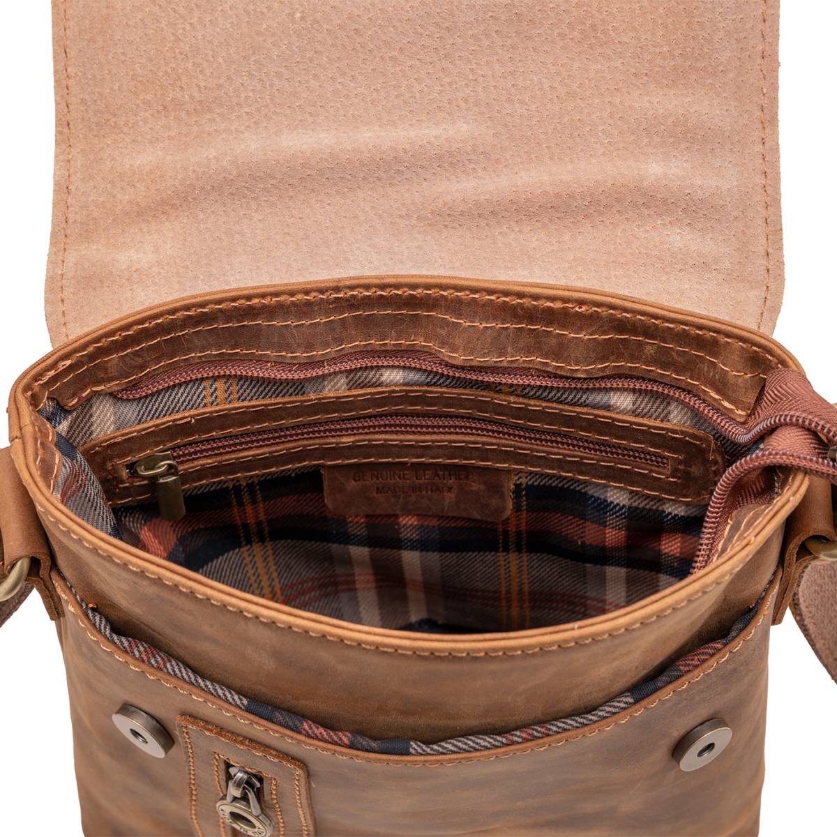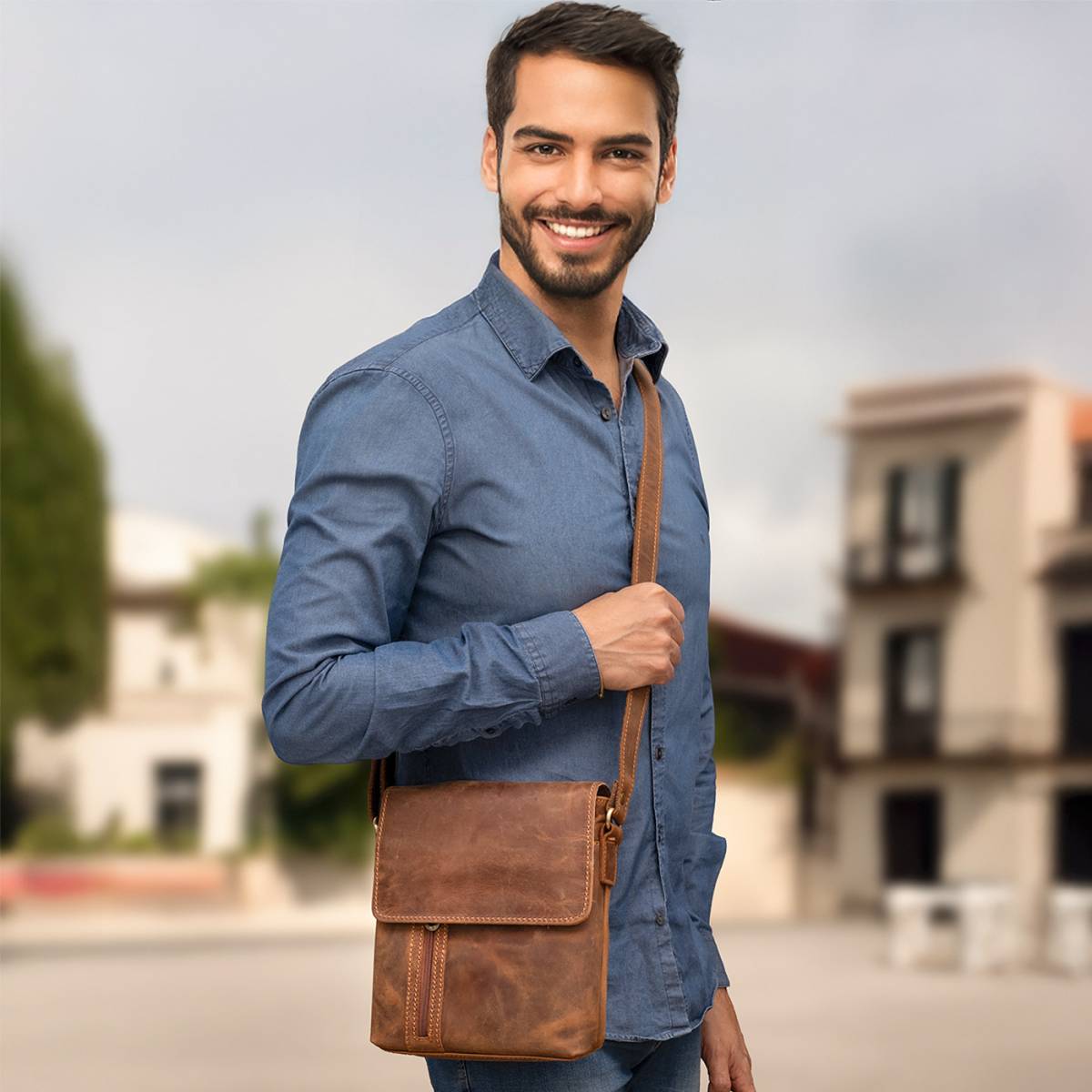 Genuine leather bag for men. Adjustable shoulder strap. One internal lined compartments. Back and front pocket with zip.