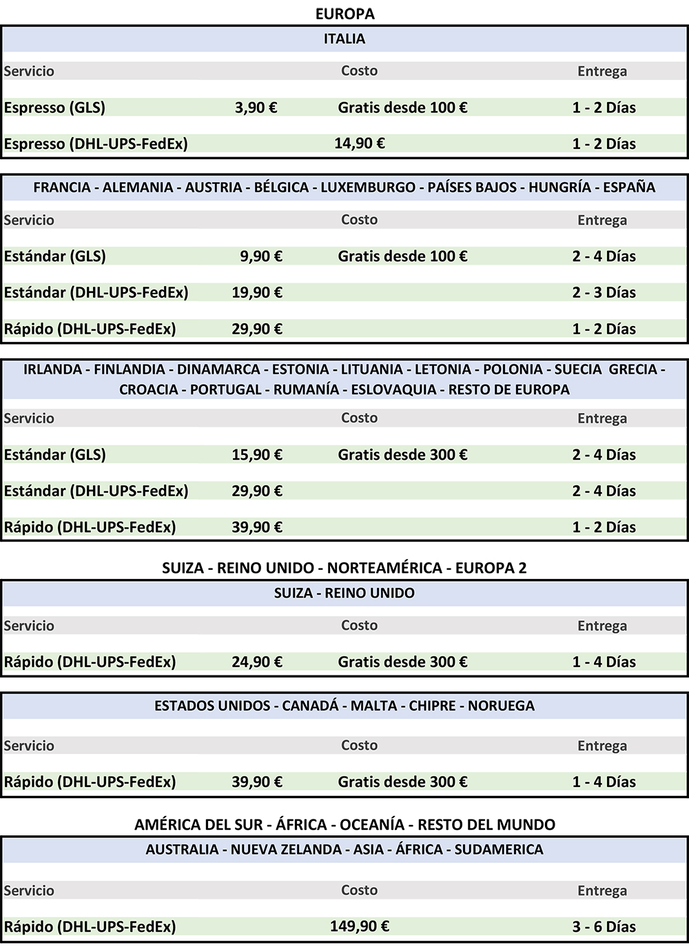 Reino Unido: de conformidad con las disposiciones legales de las autoridades inglesas relacionadas con la importación de bienes al Reino Unido, podemos aceptar y enviar pedidos que contengan bienes con un valor mínimo de 169 euros, excluyendo los costos de envío.