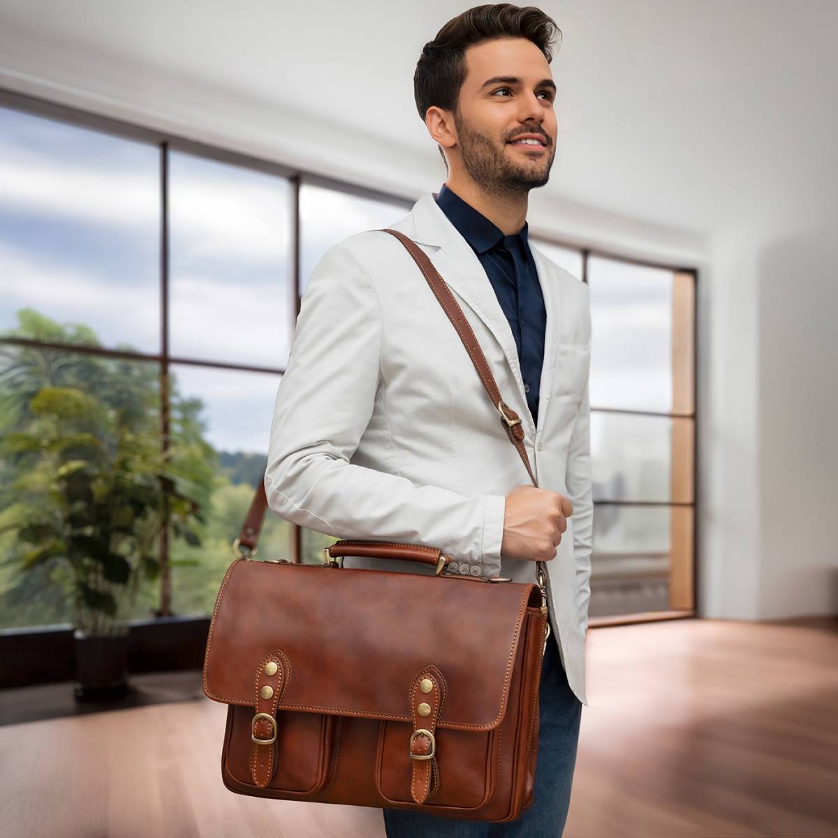 Maletín de piel auténtica con dos compartimentos interiores de piel auténtica, dos amplios bolsillos delanteros y un tercer bolsillo grande con cremallera. Bolsillo trasero con cremallera metálica latonada. El bolso incluye portabolígrafos, tarjetero y soporte para móvil. Cierre principal con botones metálicos. Correa de hombro ajustable y extraíble que se puede fijar a los laterales del bolso o en la parte superior, cerca del asa. Professionele tas, perfect voor het dragen van documenten en uw laptop.