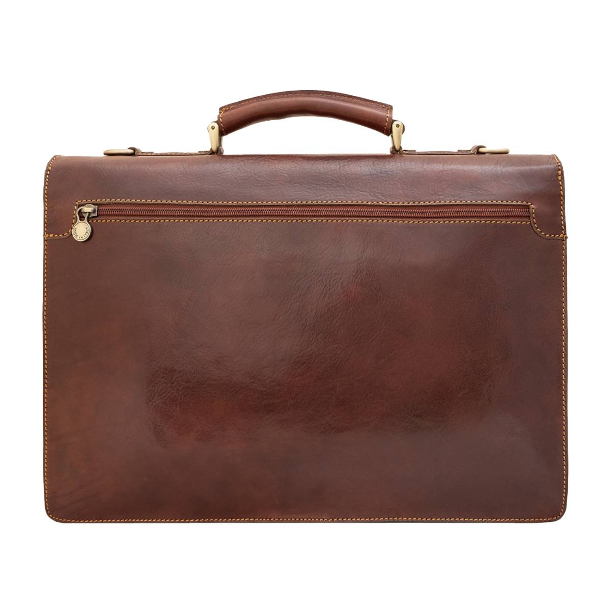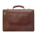 Bőr aktatáska. Két rekesz, nagy központi zsebbel, két elülső zsebbel. Állítható és levehető vállpánt.