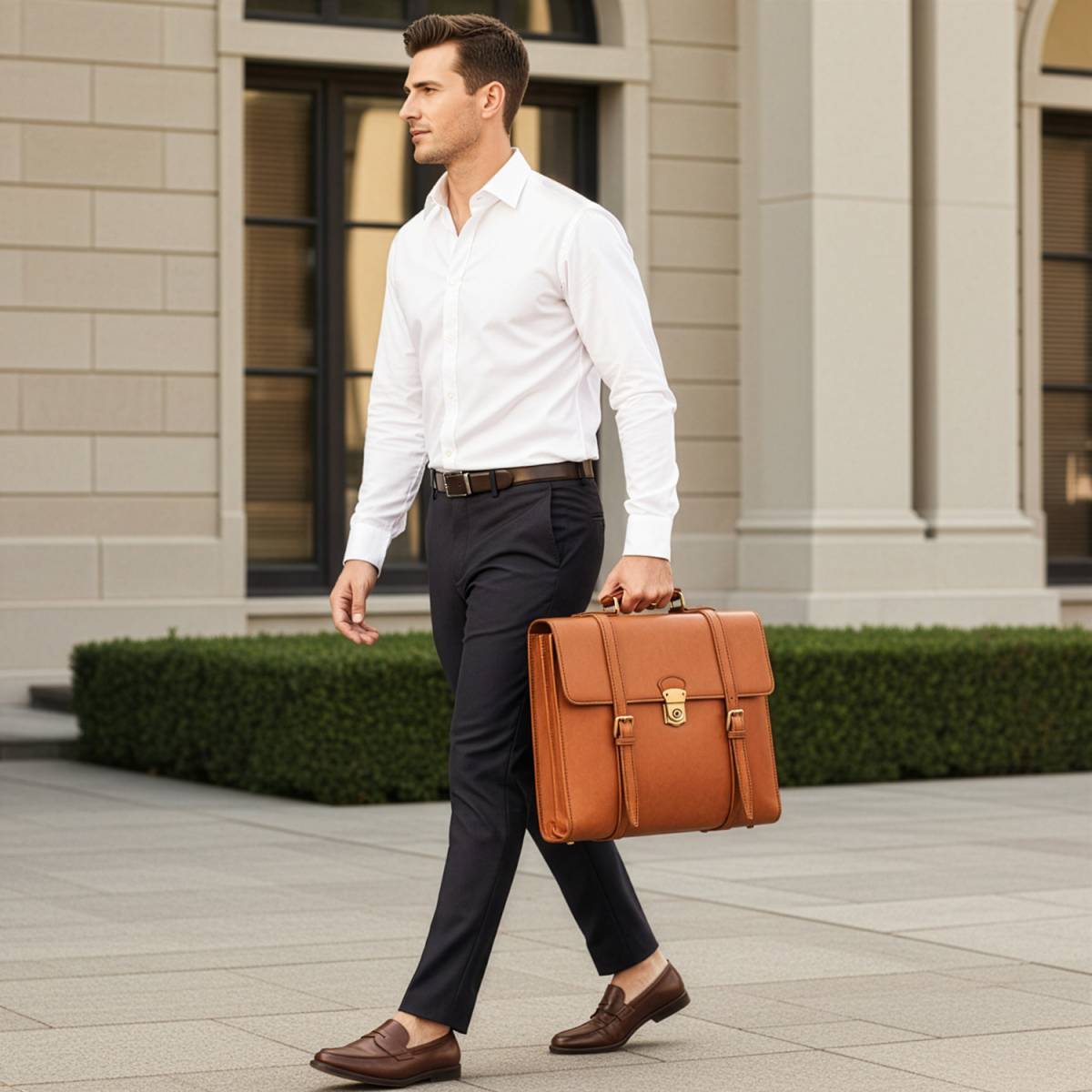 Bőr aktatáska. Egy rekesz laptop zsebével. Állítható és levehető vállpánt. Hátizsákként is felhasználható.