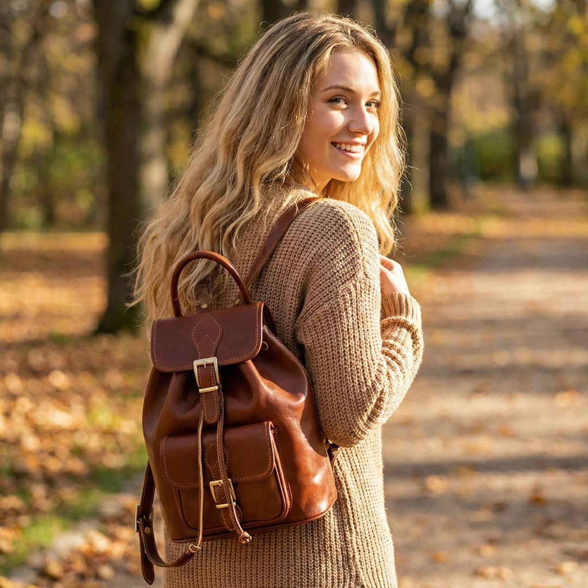 Bőr hátizsák. Egy fő rekesz természetes bőrrel készítve, egy elülső zseb. Főzáró csipkével és csattal, az első zseb mágneses gombbal.