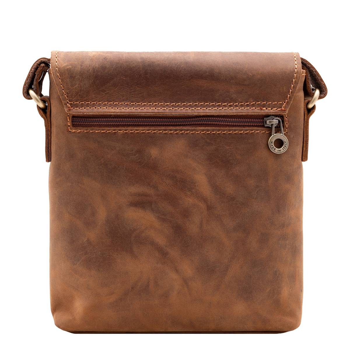 Borsello con tracolla regolabile in vera pelle di bufalo. Tracolla regolabile. Scomparto internamente foderato, tasca interna con zip. Tasca anteriore e posteriore con zip