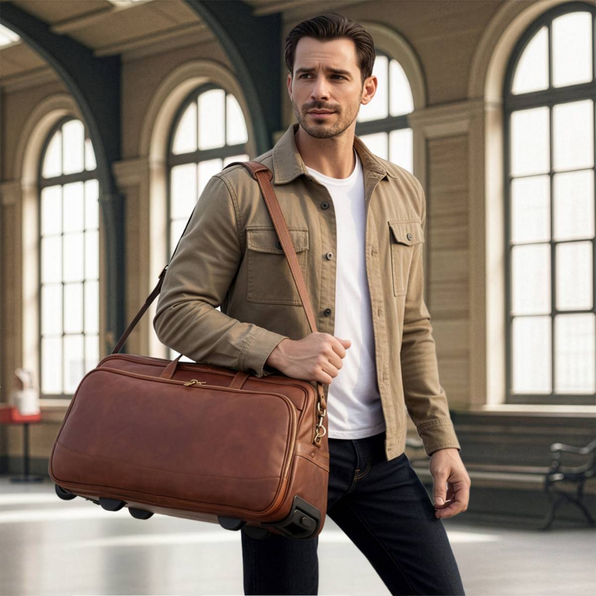 Borsone con ruote realizzato a mano in Italia con manico a scomparsa, realizzato con pregiata pelle italiana pieno fiore e conciata solo con oli vegetali, questa borsa unisce un’ottima capienza ad un design personale che affascina al primo sguardo. I tocchi pratici come l'ampia tasca frontale e la tracolla regolabile e removibile ne esaltano la praticità e la comodità. Le zip in metallo ottonato YKK offrono un tocco vagamente vintage ed una scorrevolezza ed un'affidabilità ai massimi livelli. La produzione raffinata, i materiali pregiati e il design personale di questa borsa la rendono una compagna perfetta per un viaggio, un weekend o anche come borsa da palestra.
