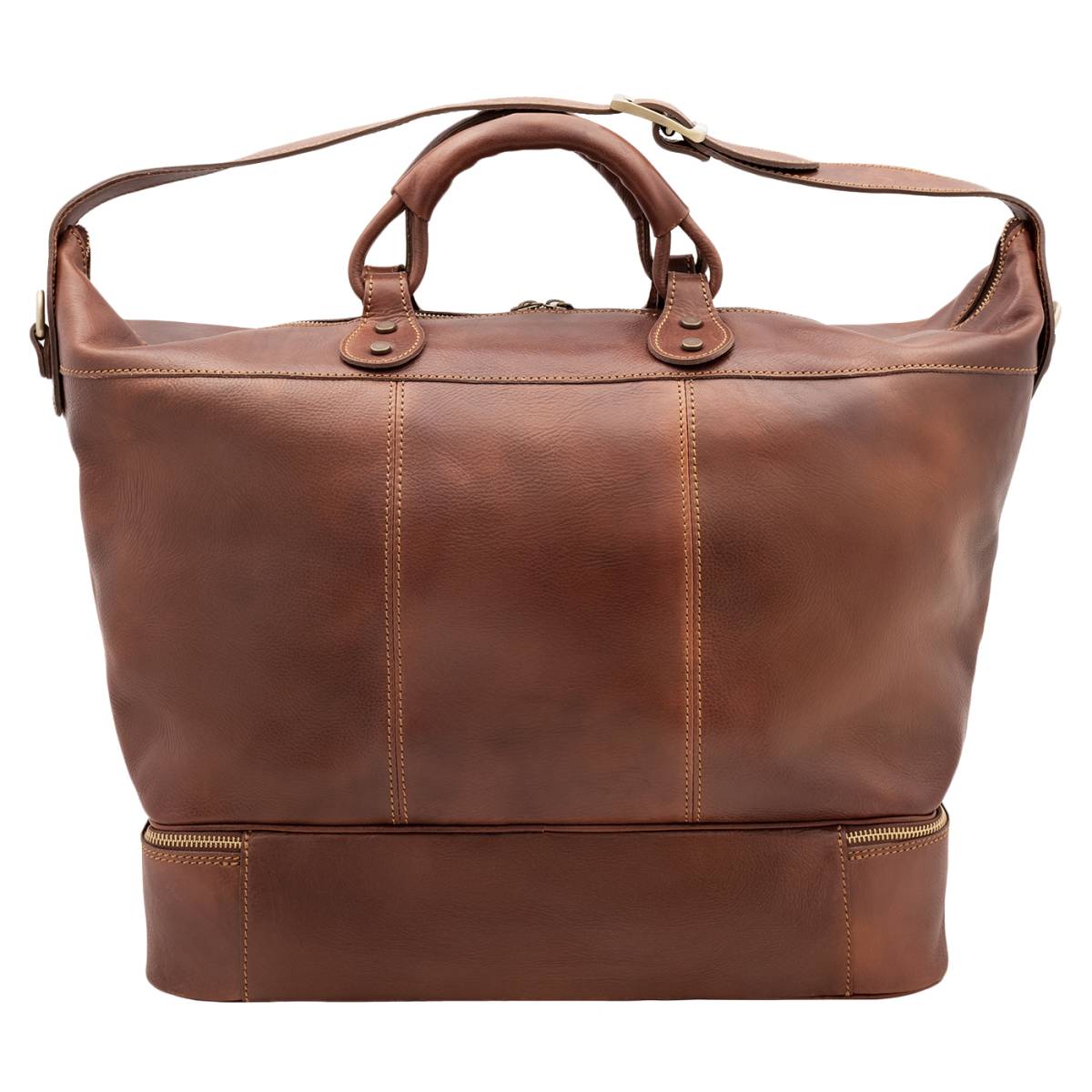 Borsa da viaggio in vera pelle. Fodera interna in cotone. Grande tasca sul fondo. Tasca interna con zip e chiusura lampo in metallo, tracolla removibile e regolabile.