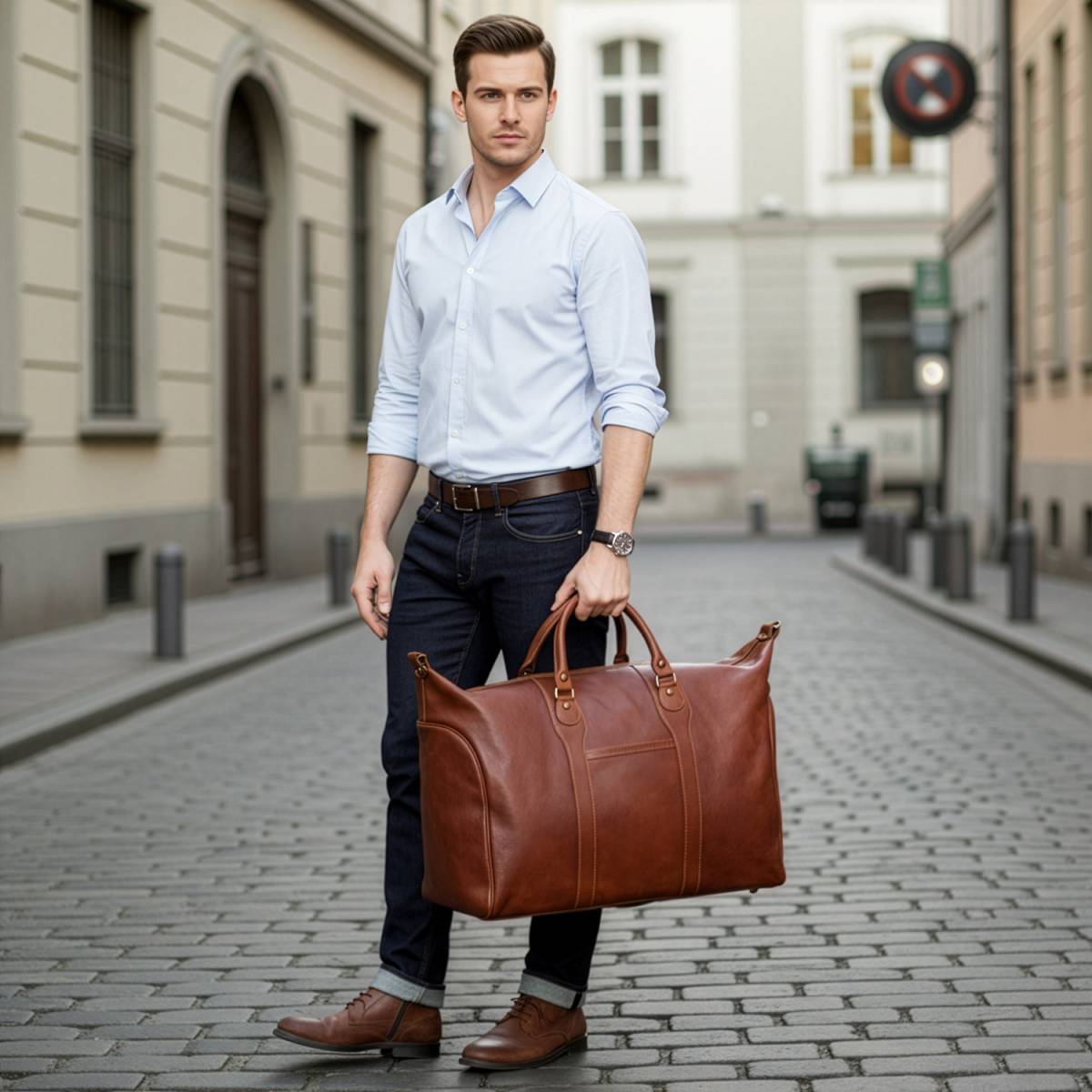 Borsa da viaggio in vera pelle. Fodera interna in cotone. Tasca interna con zip e chiusura lampo in metallo, tracolla removibile e regolabile.