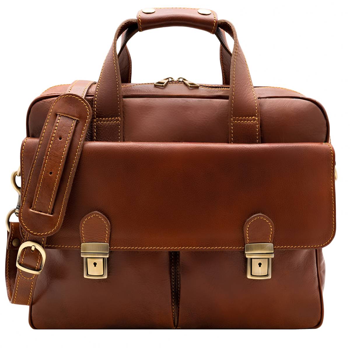 Aktetas en laptoptas van echt leer met verstelbare en afneembare schouderband. Twee interne met stof beklede compartimenten, intern laptopvak, intern telefoonvak. Twee grote zakken aan de voorkant en een zak aan de achterkant. Handvat aan de achterkant waarmee deze tas aan een koffer kan worden bevestigd.