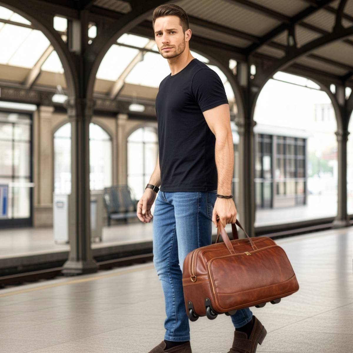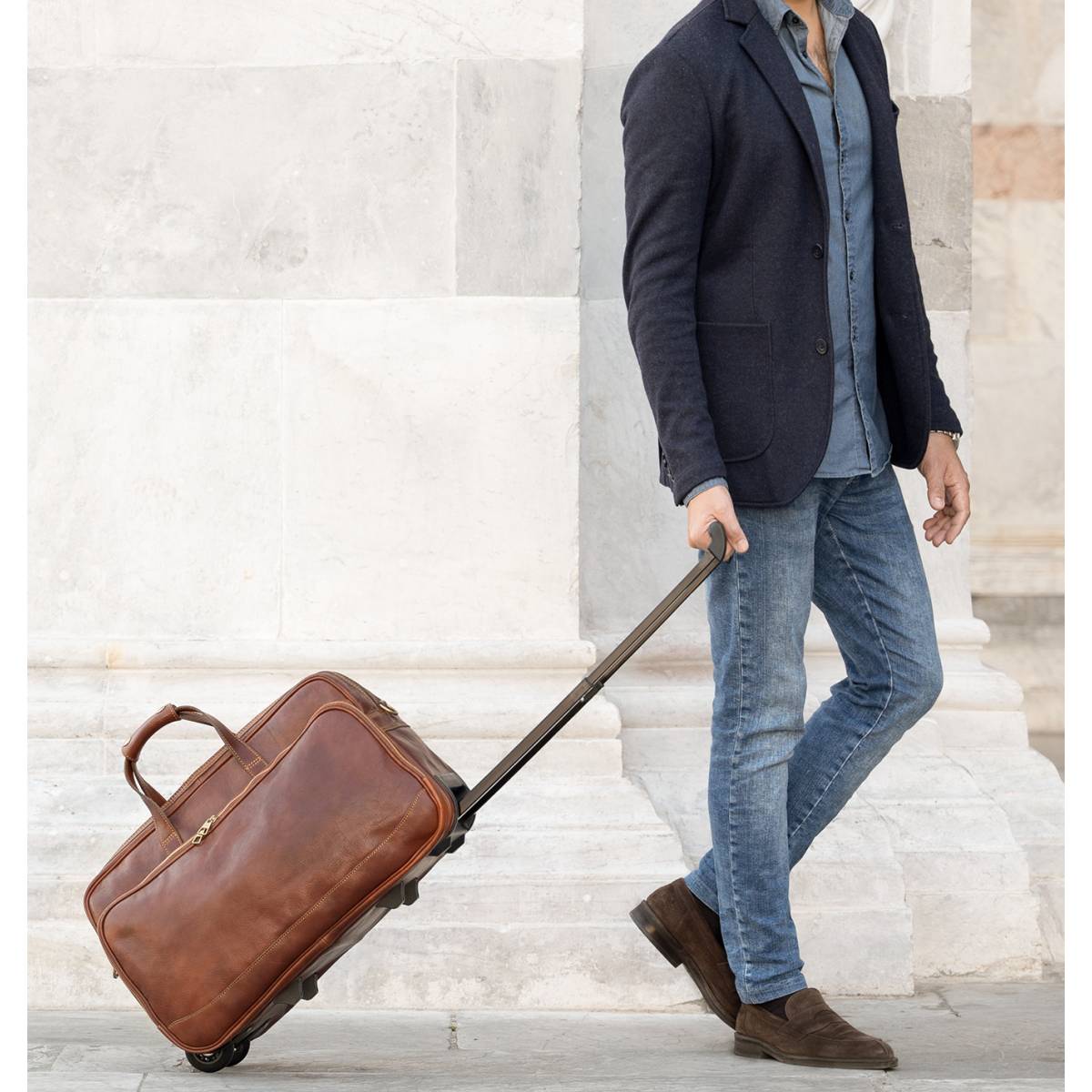 Reistas op wielen, handgemaakt in Italië met fijn volnerf Italiaans leer en alleen gelooid met plantaardige oliën, deze tas combineert een uitstekende capaciteit met een persoonlijk ontwerp dat op het eerste gezicht fascineert. Praktische details zoals het grote voorvak en de verstelbare en afneembare schouderriem vergroten het gebruiksgemak en het comfort. De met messing beklede metalen YKK-ritsen bieden een vaag vintage tintje en maximale soepelheid en betrouwbaarheid. De verfijnde productie, hoogwaardige materialen en het persoonlijke design van deze tas maken hem tot een perfecte metgezel voor op reis, een weekend of zelfs als sporttas.
