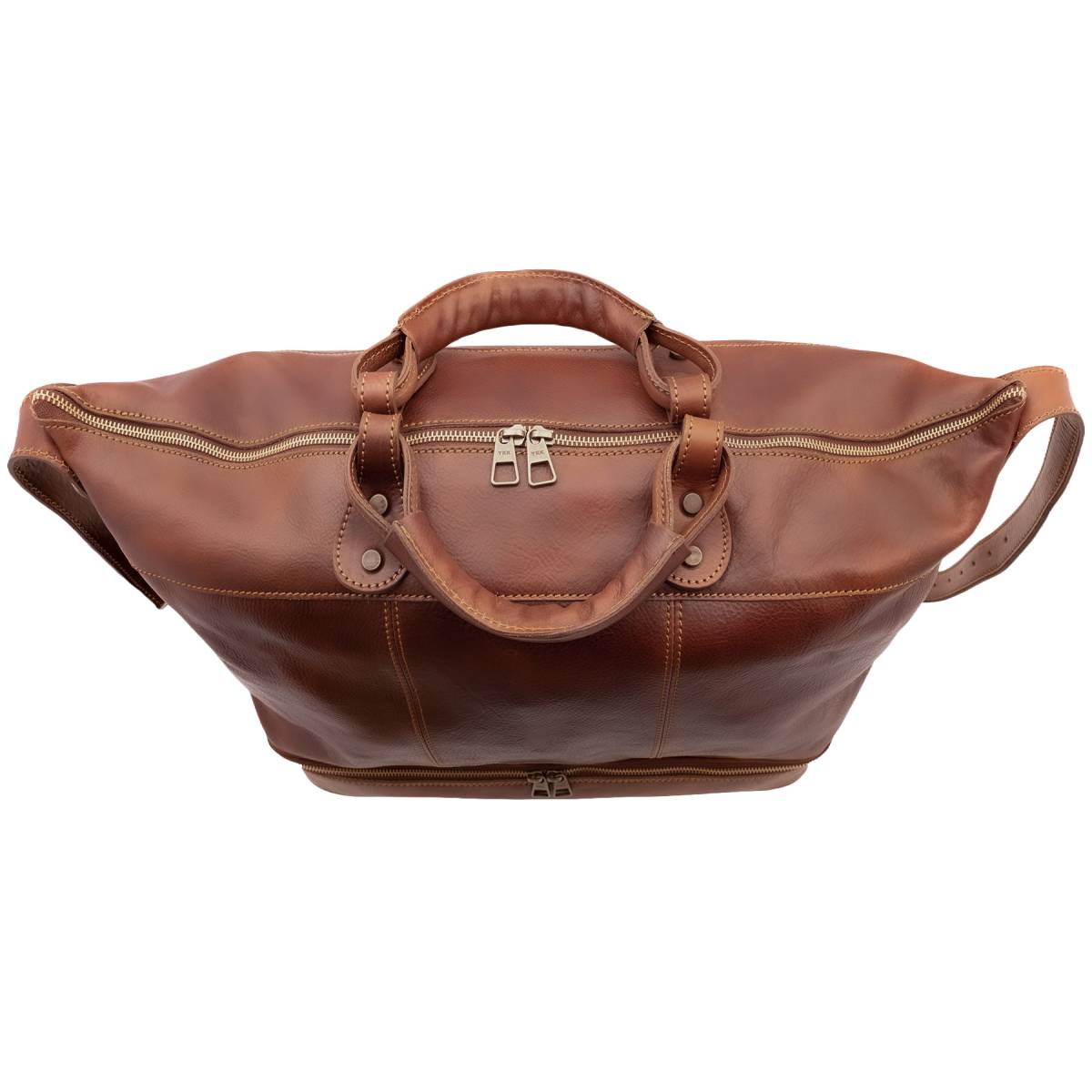 Reistas van echt leer. Katoenen voeringvak. Groot vak aan de onderkant. Binnenzak met ritssluiting, afneembare schouderriem. Ritssluiting van metaal.