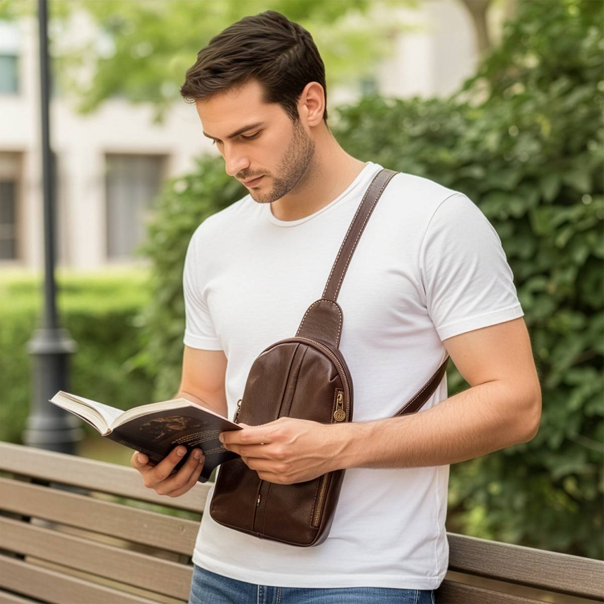 Echt leren schoudertas voor heren met verstelbare schouderband. Twee compartimenten met stoffen voering. Leren riem. Deze tas die op de borst en rug kan worden gebruikt, dun en vol met zakken, is een perfecte reisgenoot, kan ook met een rugzak worden gedragen en is comfortabel tijdens het gebruik van een motor of fiets. Omtrek max 145 cm